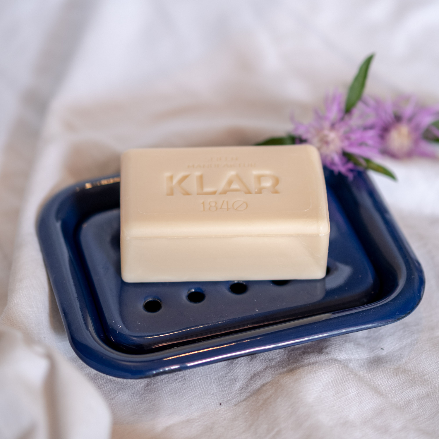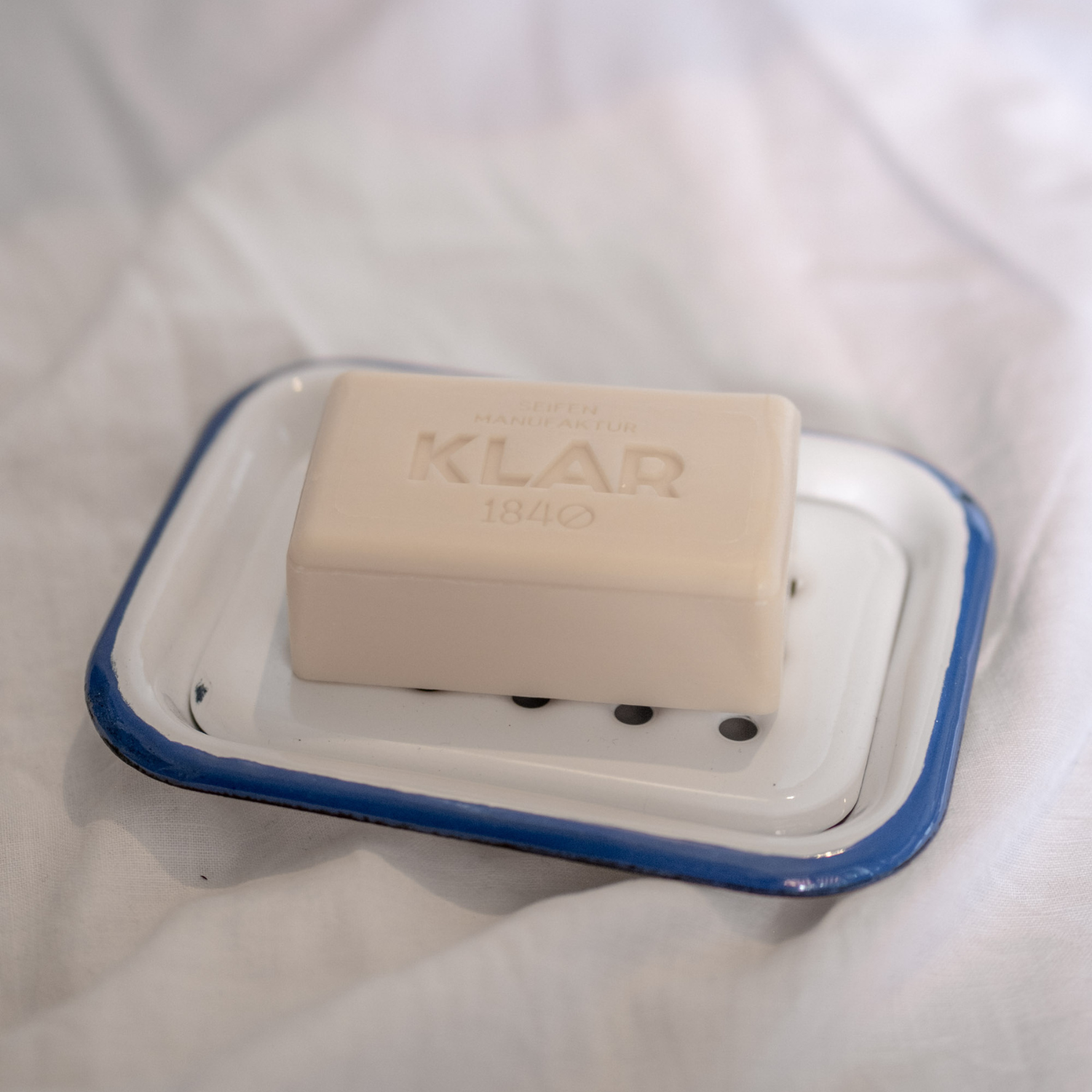 Klar’s Seifenschale aus widerstandsfähigem und langlebigem Email verhindert dank des integrierten Abtropfgitters das Weichwerden der Seife.