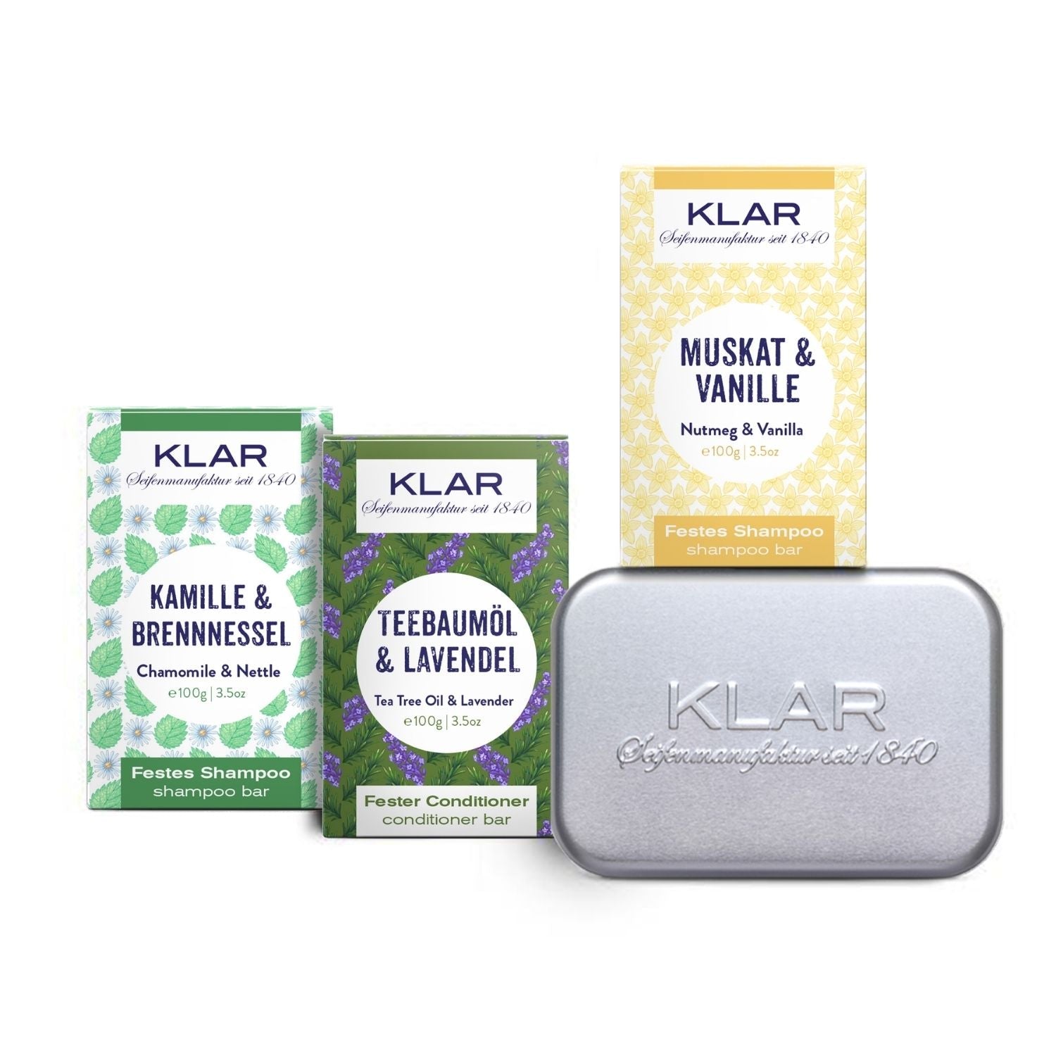 Klar’s Set mit drei festen Shampoos und einer Seifendose ist das perfekte Paket für alle, die mit der Nutzung von festen Shampoos beginnen wollen.
