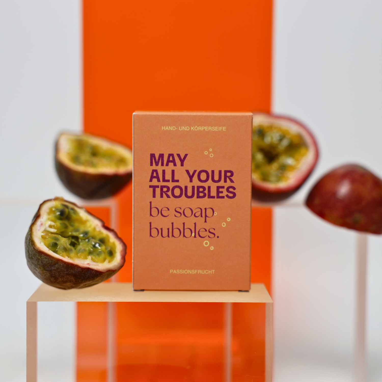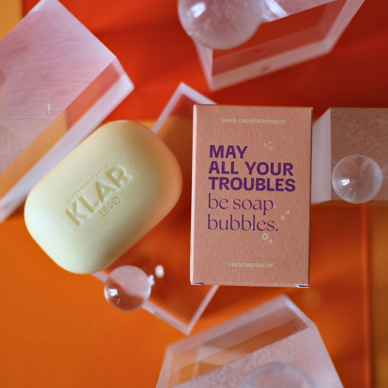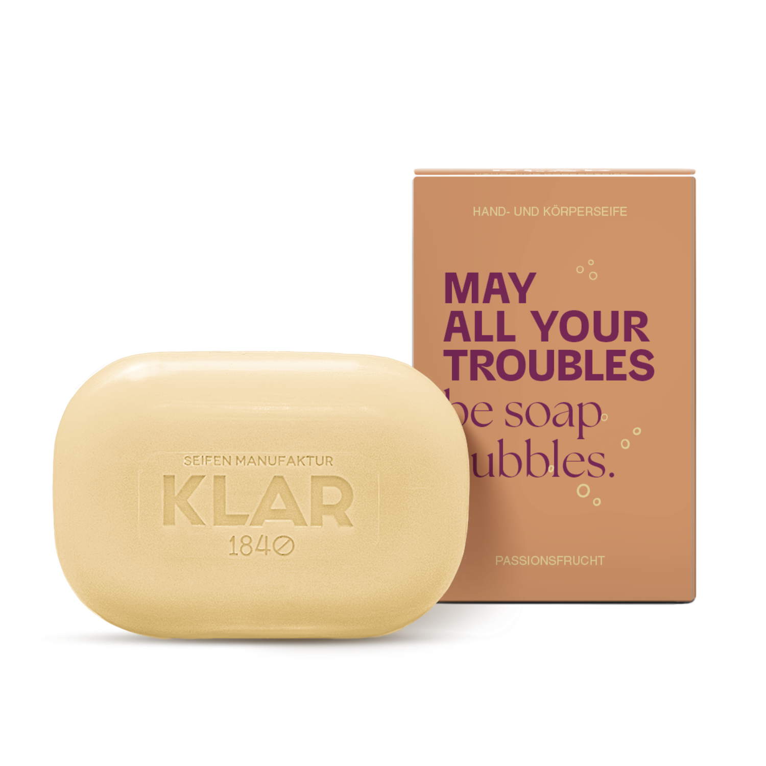 May all your troubles be soap bubbles! Bei Klar's Passionsfruchtseife ist der Name Programm, denn mit ihrem fruchtigen Duft lässt sie schlechte Laune und Sorgen im Nu zerplatzen. Das Passionsfrucht-Aroma sorgt nicht nur für good vibes beim Duschen sondern verwandelt Ihr Badezimmer in eine tropische Oase. Angereichert mit feuchtigkeitsspendender Aloe Vera, pflegt die Seife die Haut und schützt sie vor dem Austrocknen.