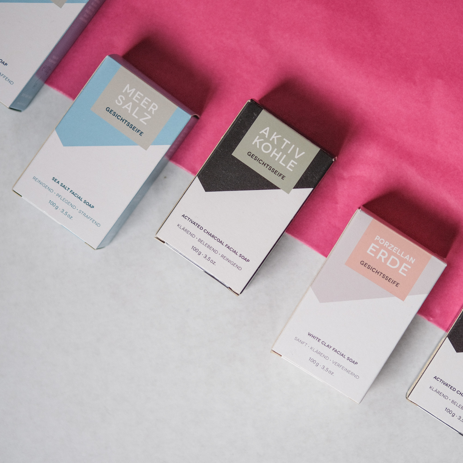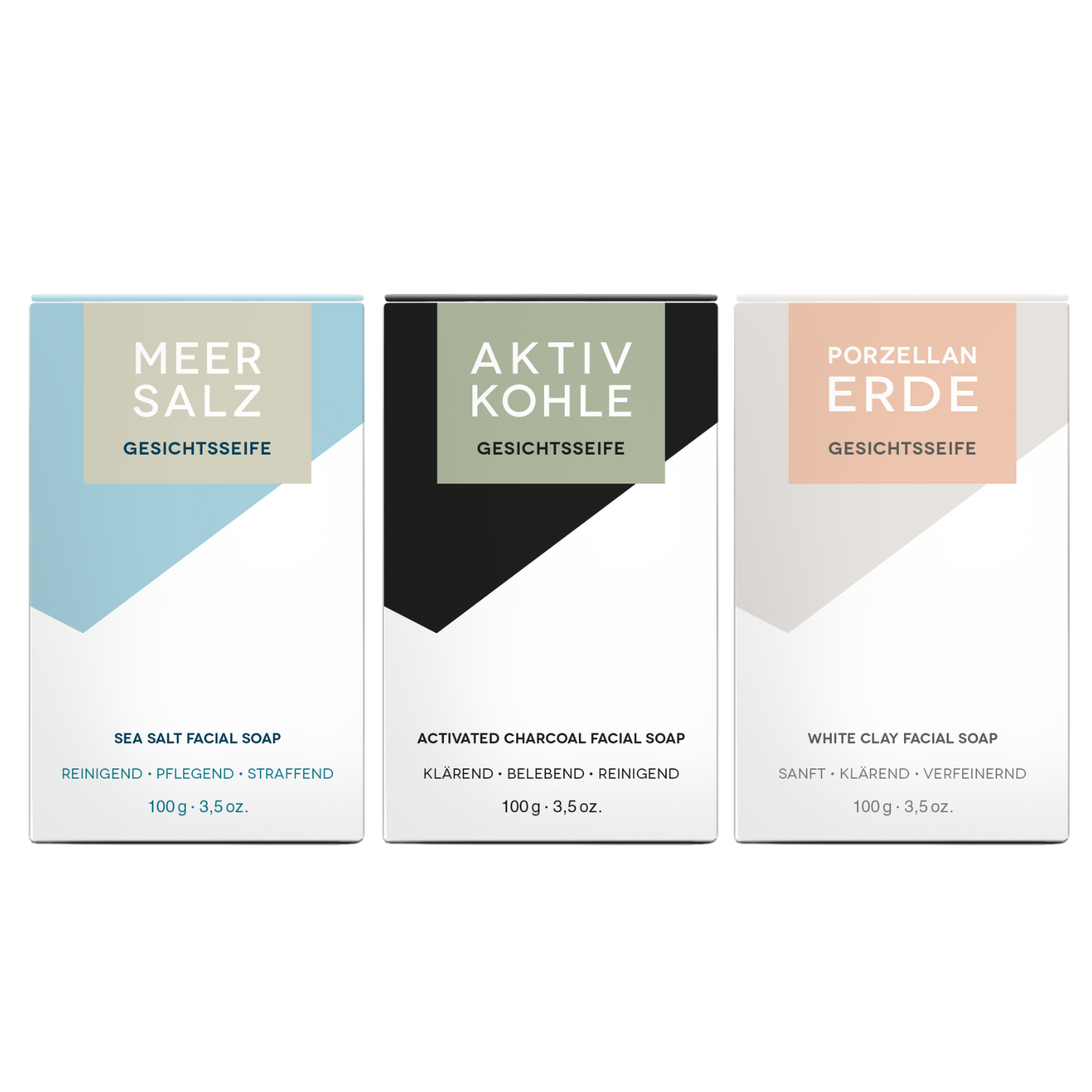 Geschenkset Gesichtsseifen (Meersalz, Aktivkohle, Porzellanerde), Cosmos zertifiziert, palmölfrei