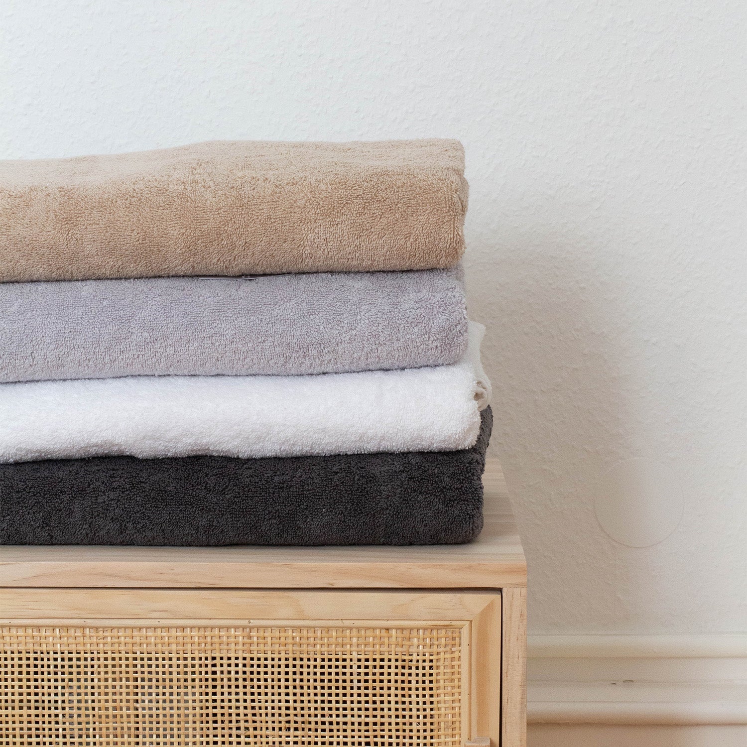 Unsere Hand-, Gäste und Duschtücher gibt es in weiß, sand, hell- und dunkelgrau.