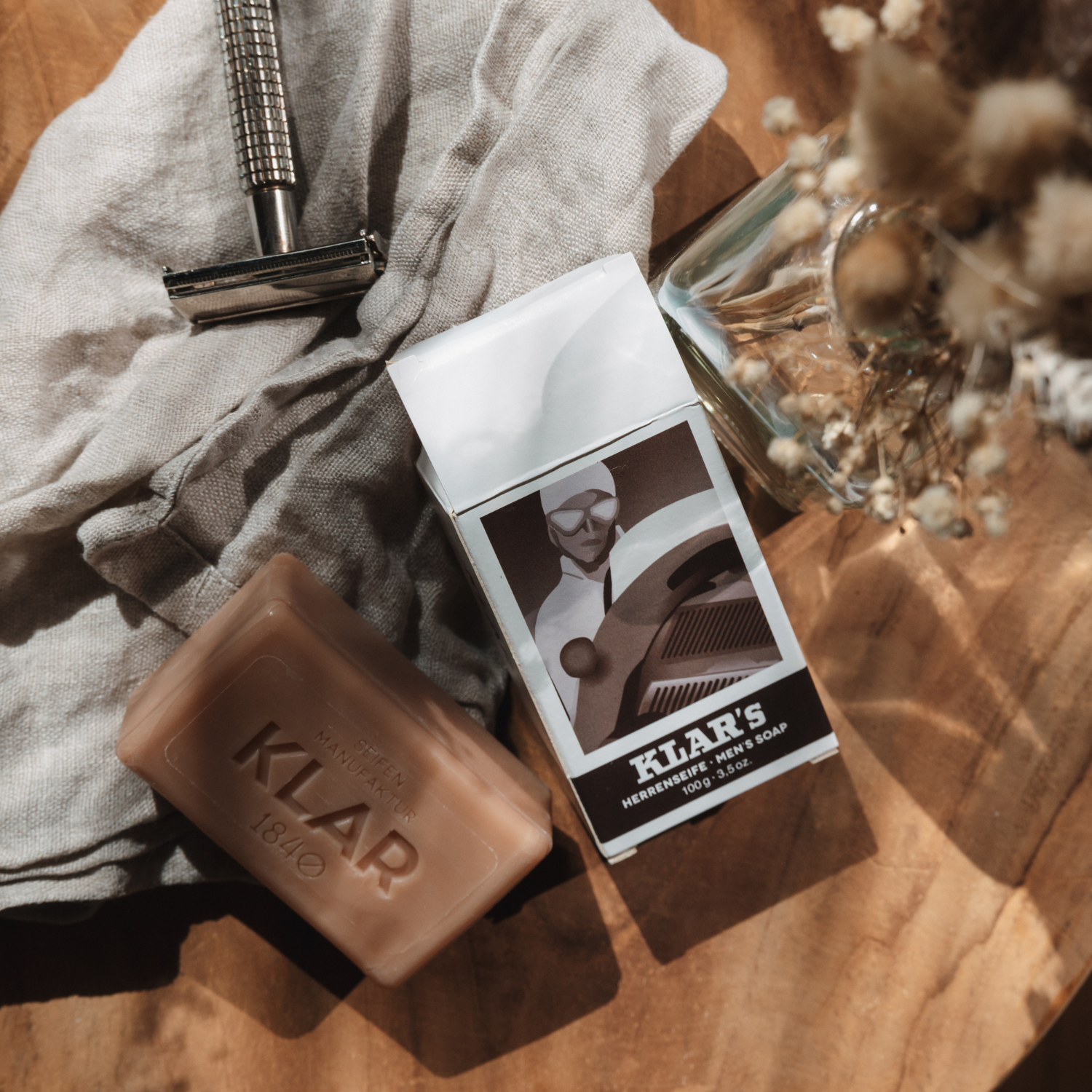 Klar‘s Herrenseife mit ihrer herben und männlichen Sandelholz-Duft ist ein Klassiker für Jedermann. Sie ist frei von künstlichen Farbstoffen und pflegt mit reichhaltigen, pflanzlichen Ölen auch empfindliche Männerhaut. Das Motiv der Umverpackung stammt aus der Klar Seifen Werbung der 50er Jahre.