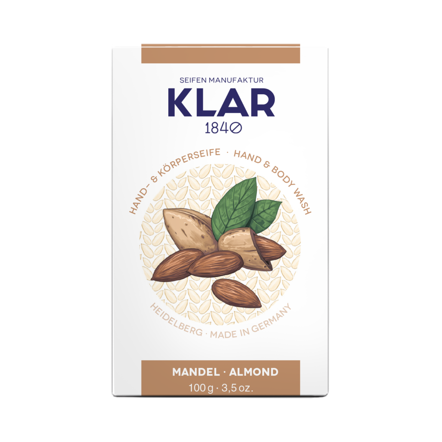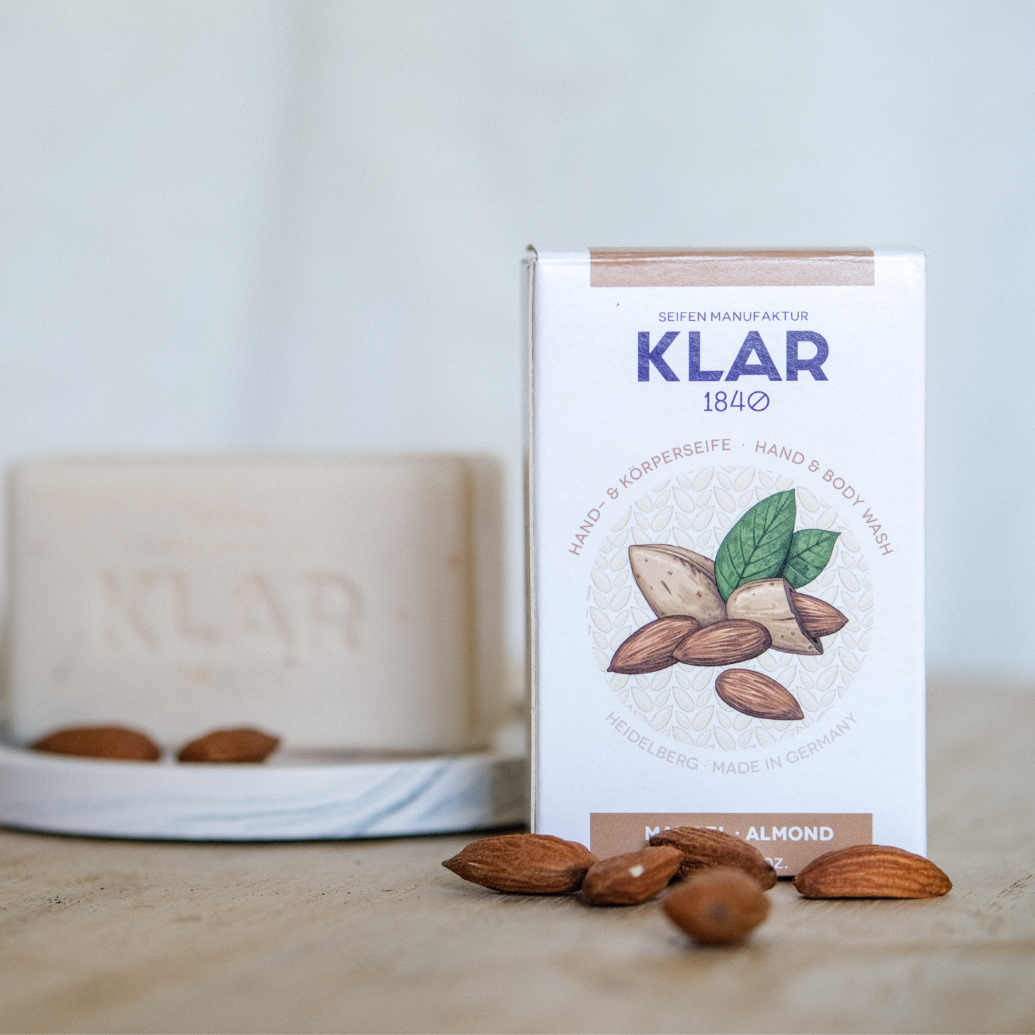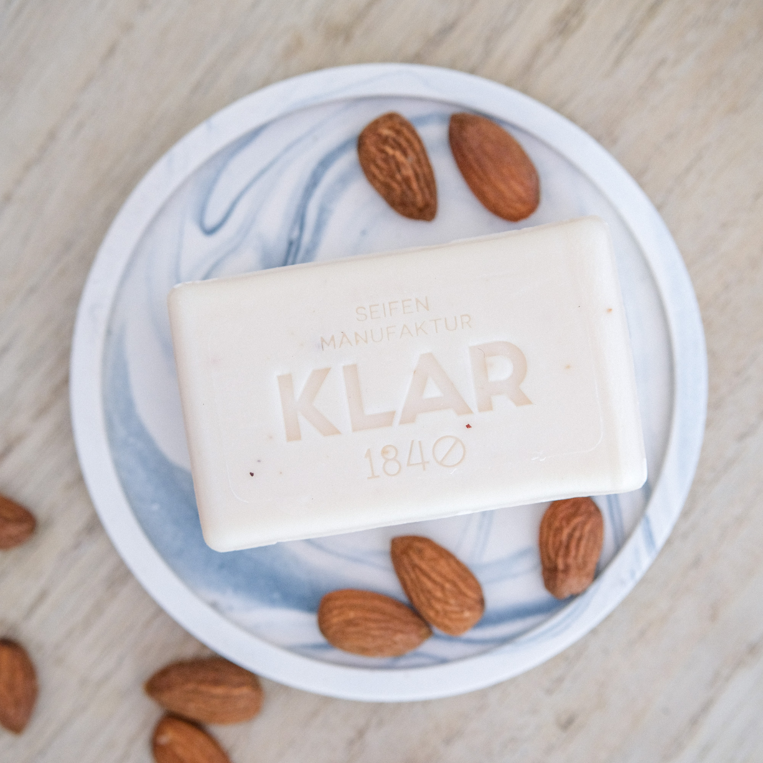 Klar’s Mandelseife pflegt trockene und raue Haut besonders sanft. Das in den Mandeln enthaltene Vitamin E wirkt antioxidativ, während das Mandelöl die Haut mit Feuchtigkeit versorgt und sie geschmeidig macht. Der süße Duft von gemahlenen Mandelkernen verleiht der Seife einen warmen Charakter und wirkt wohltuend und entspannend.