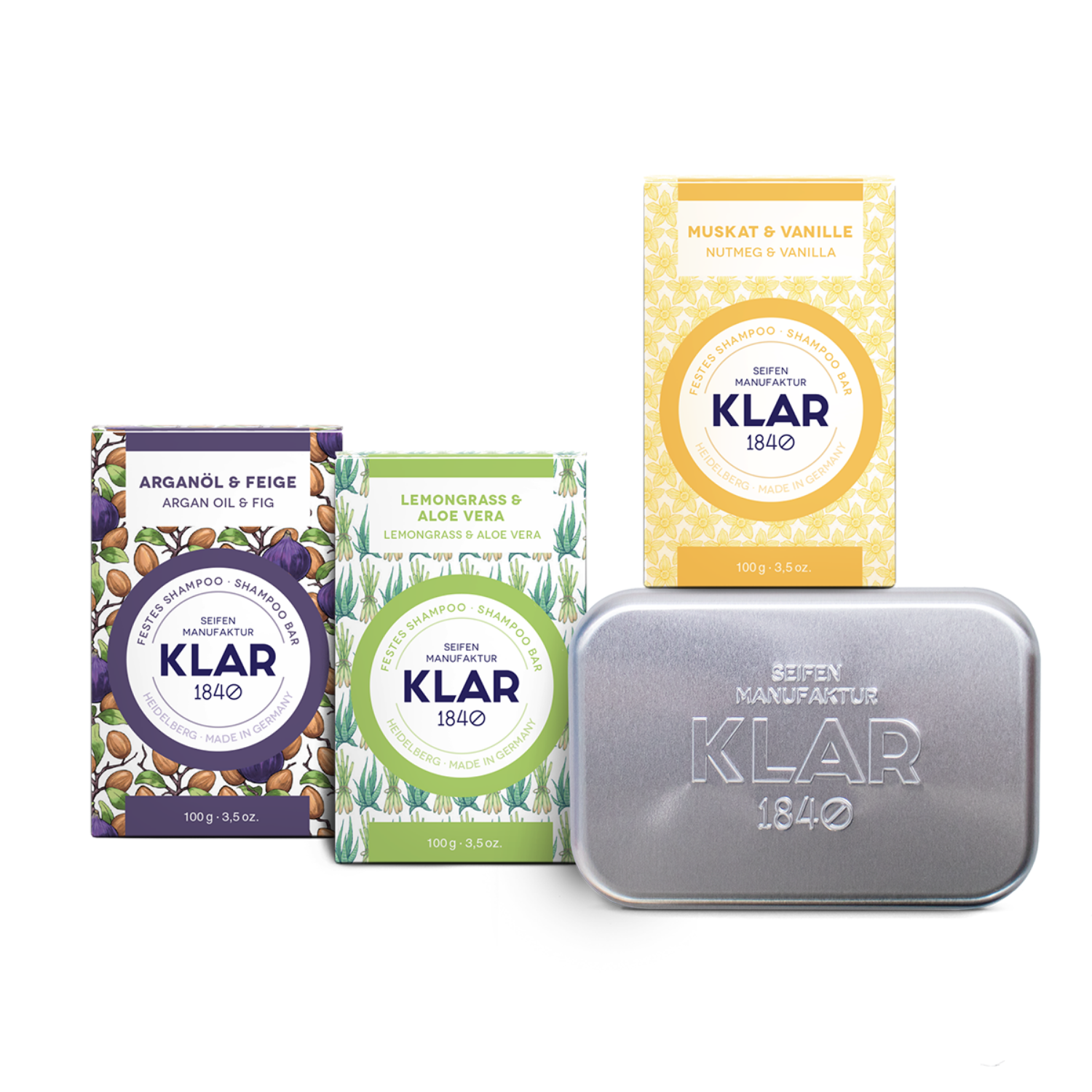Klar’s Set mit drei festen Shampoos und einer Seifendose ist das perfekte Starter-Kit für mehr Nachhaltigkeit in Ihrer Haarpflege-Routine.