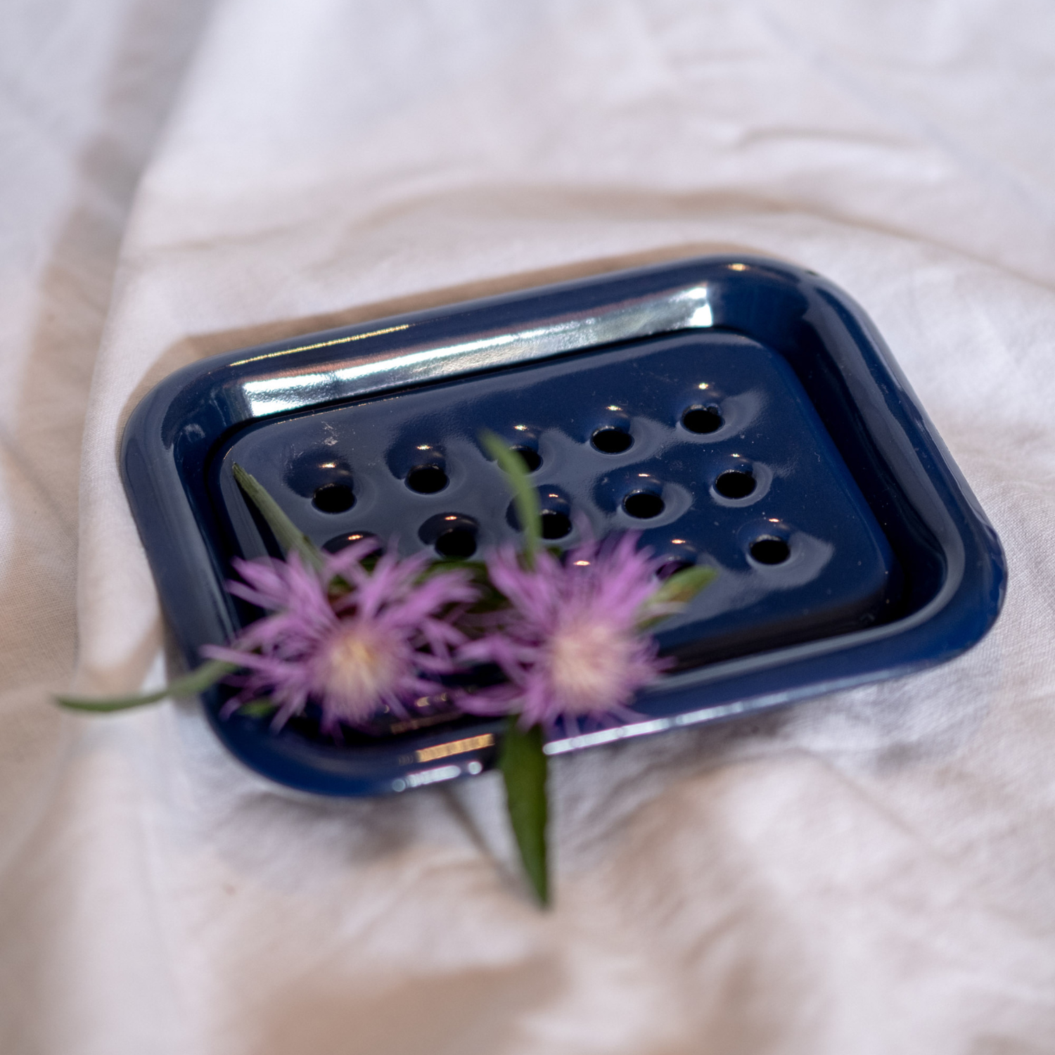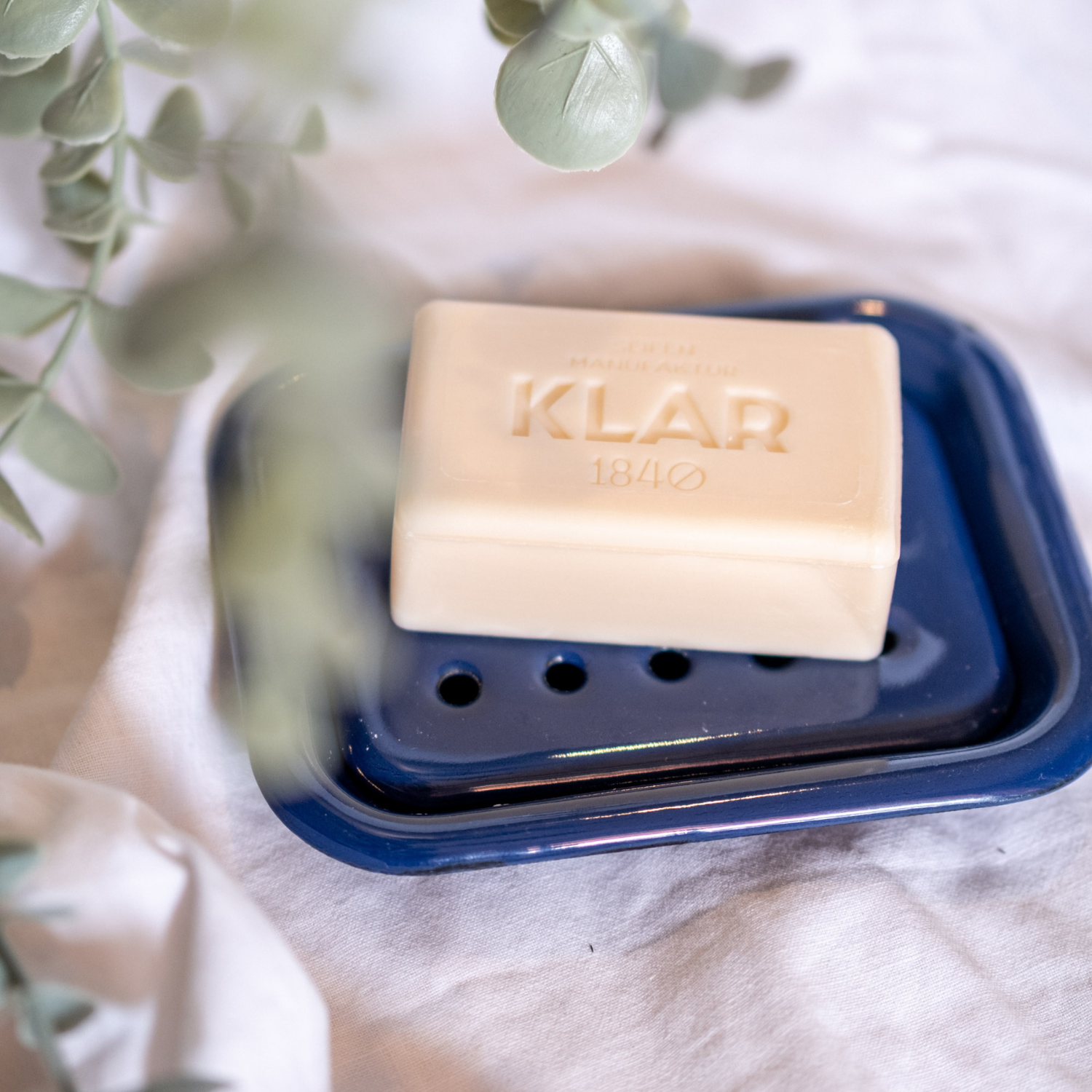 Klar’s Seifenschale aus Email im dunklen Marineblau und wirkt klassisch und modern zugleich. Das widerstandsfähige Email ist ein besonders langlebiges Material. Dank des integrierten Abtropfgitters weicht die Seife nicht auf.