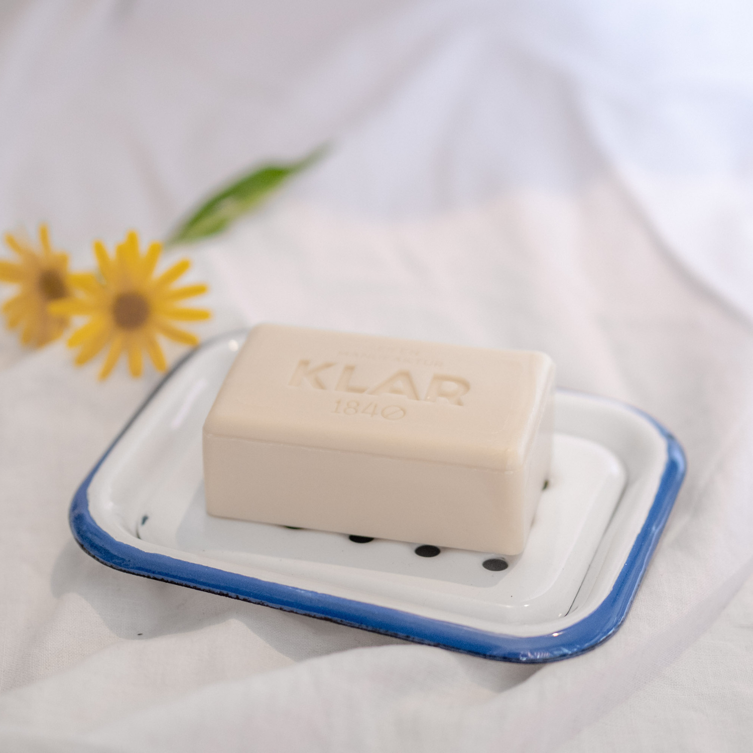 Klar’s Seifenschale aus Email kommt im klassischen Look in weiß-blau und passt in jedes Badezimmer. Das widerstandsfähige Email ist ein besonders langlebiges Material. Dank des integrierten Abtropfgitters weicht die Seife nicht auf.