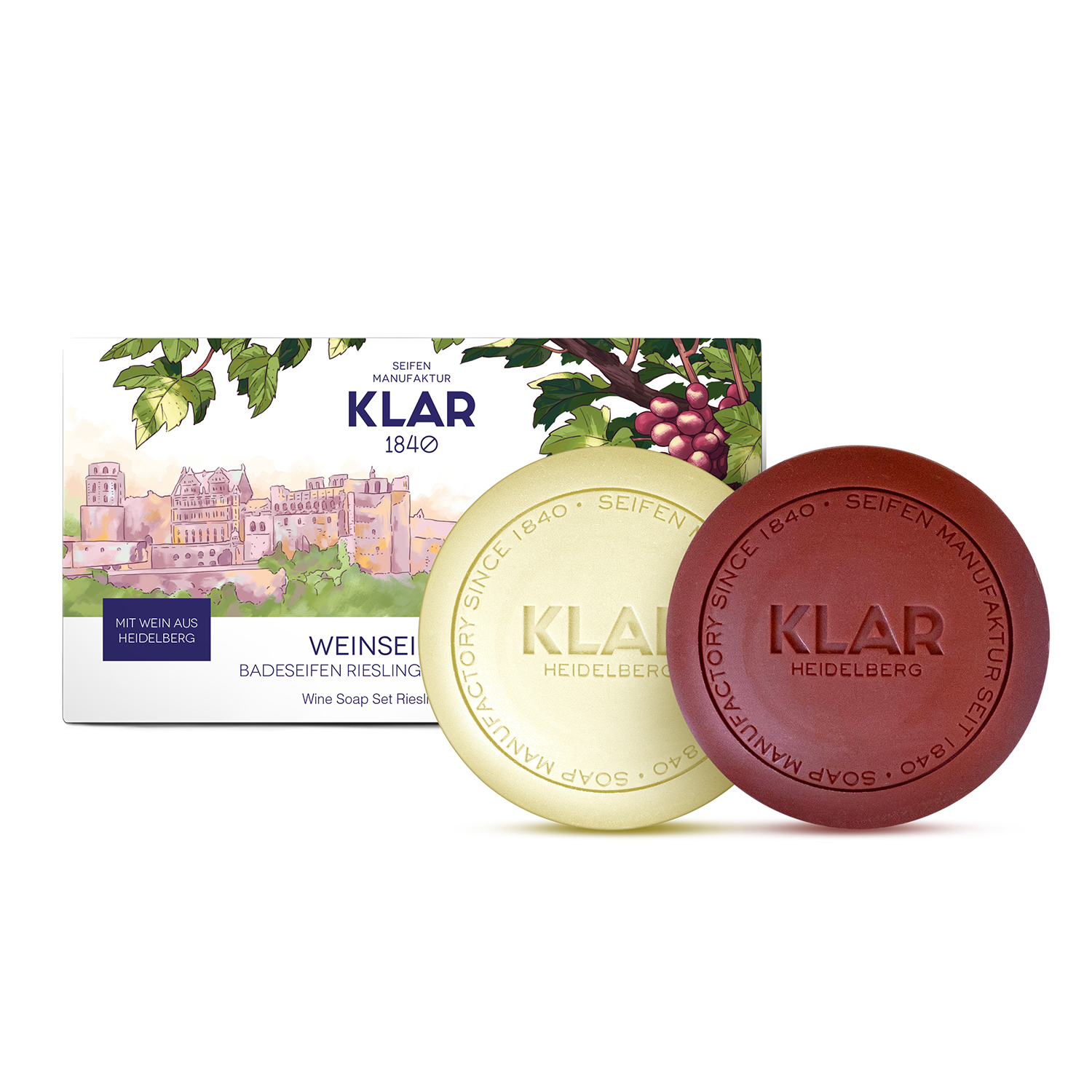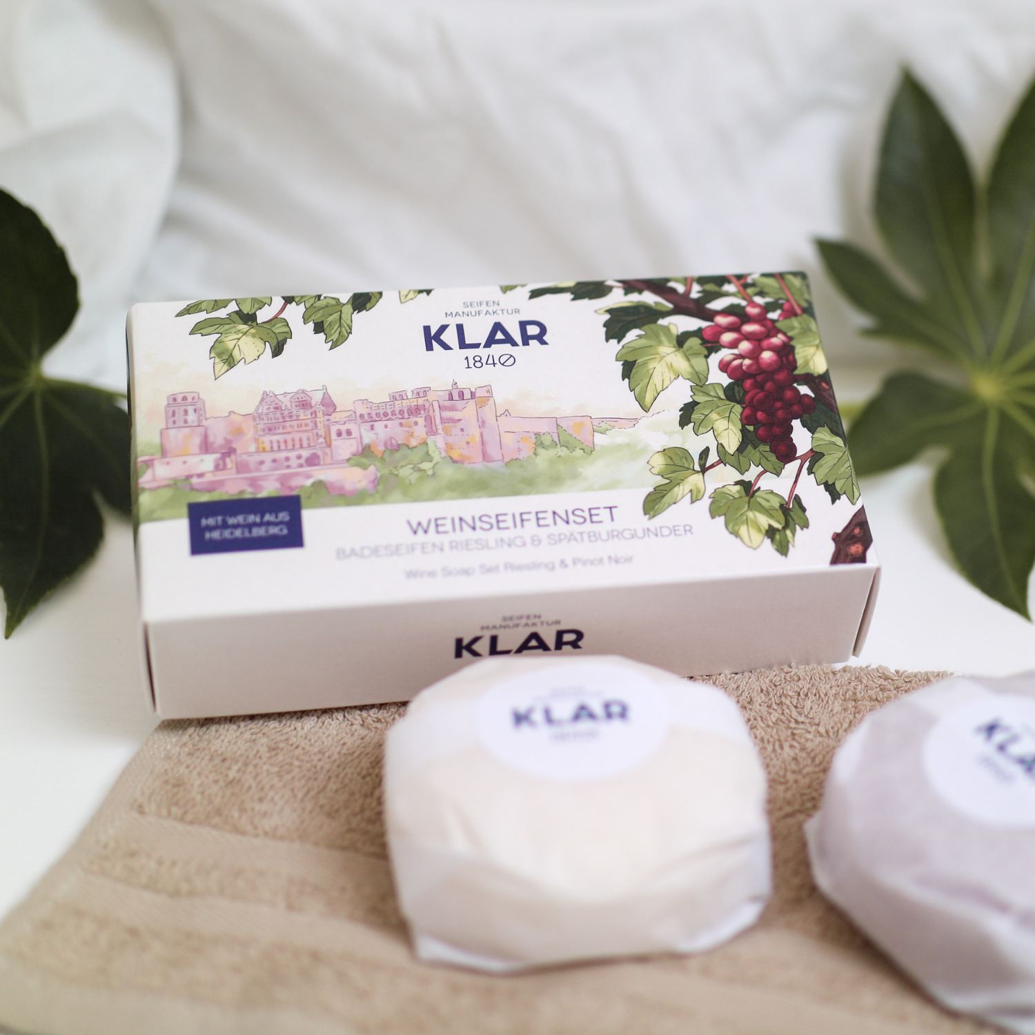 Klar’s Weinseifenset ist ein tolles Präsent - nicht nur für Weinliebhaber. Unsere beiden Weinseifen sind auf Basis von echtem Riesling und Spätburgunder aus Heidelberg hergestellt. Neben dem spritzigen bis warmen Duft überzeugen die Seifen mit ihrer Wirkung. Das enthaltene Traubenkernextrakt hat eine antioxidative und regenerative Wirkung, strafft die Haut und schenkt ihr besonders viel Feuchtigkeit.